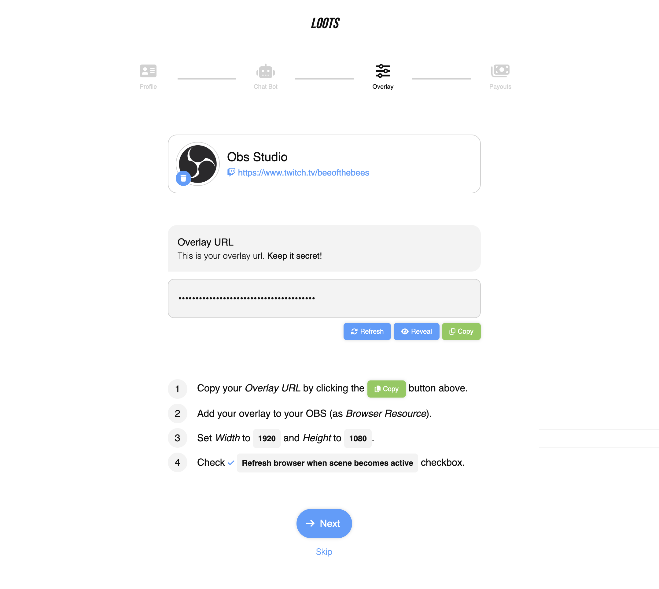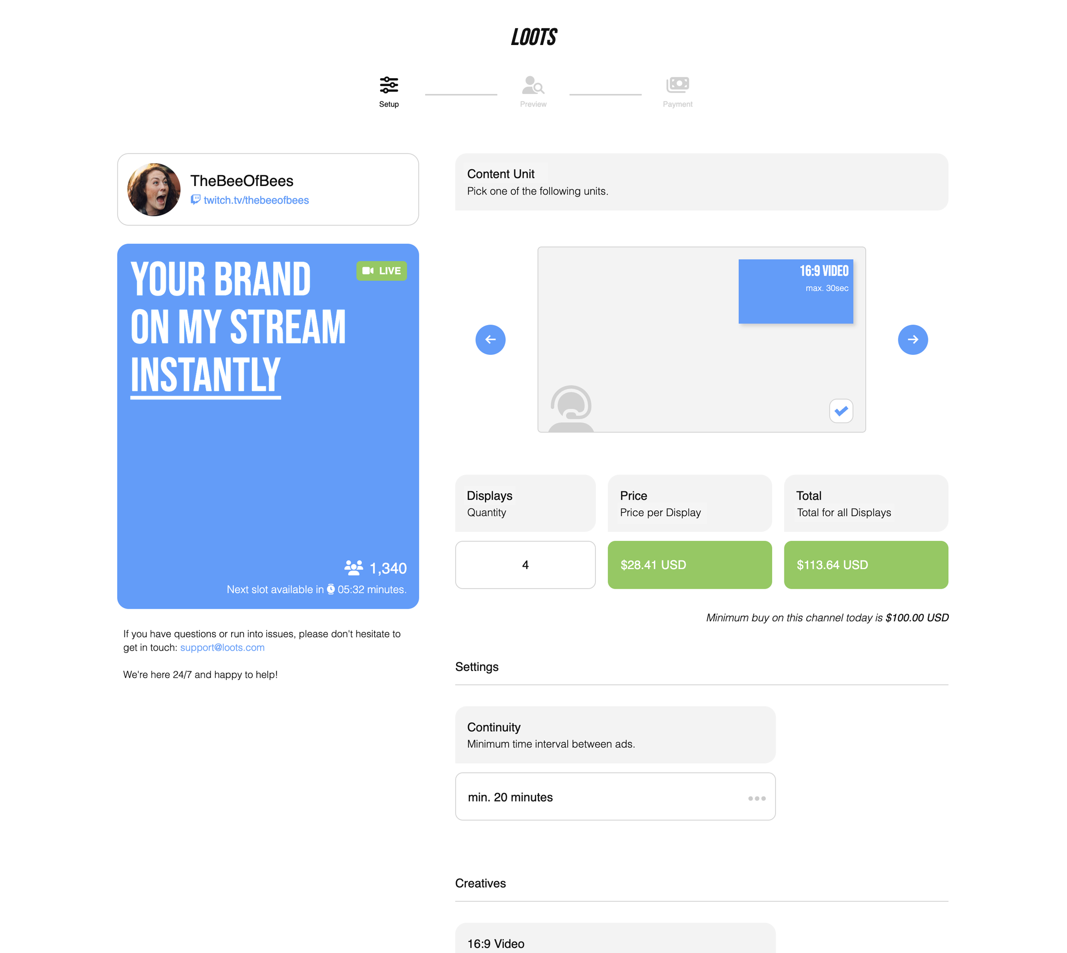 By clicking the Loots button, brands are taken to a simple checkout page where they can buy their slot on your stream.